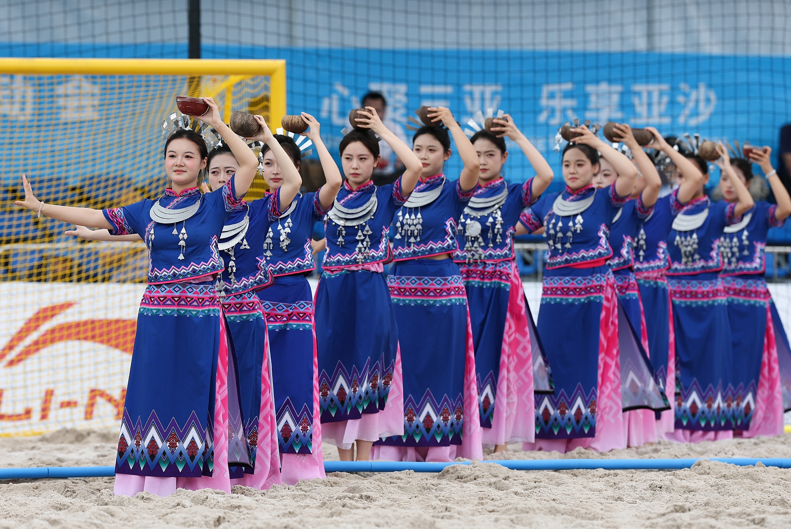 4月21日,第六届亚洲沙滩运动会沙滩手球男子小组赛中,比赛间隙的海南黎族舞蹈表演。(第六届亚洲沙滩运动会组委会供图)