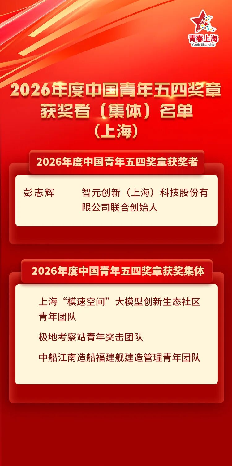 22名上海青年和3个青年集体获此殊荣。其中,彭志辉和上海“模速空间”大模型创新生态社区青年团队等3个集体荣获2026年度中国青年五四奖章(集体),李俊等21名个人荣获2026年度新时代青年先锋。