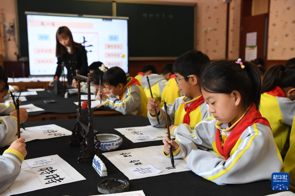 4月15日,北京市第十八中学时光学校学生在书法公开课上练习书法。新华社记者 马宁 摄