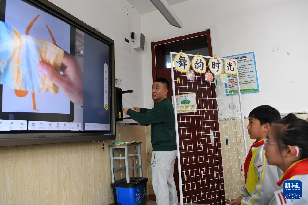 4月15日,北京市第十八中学时光学校教师狄卫晨为三年级学生讲授美术学科公开课《载歌载舞绘心声》,通过AI工具优化图案。新华社记者 马宁 摄