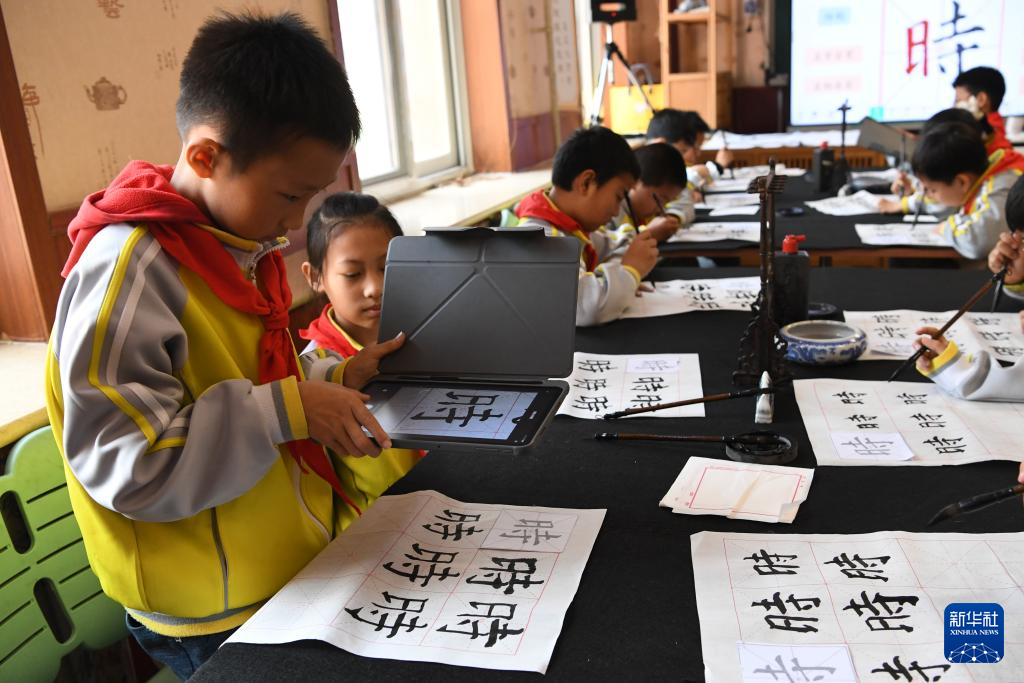 4月15日,北京市第十八中学时光学校学生在书法公开课上使用AI工具分析自己的书法作品。新华社记者 马宁 摄