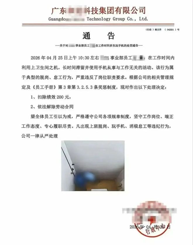 18岁员工厕所玩手机被辞退 照片被发到400多人的大群